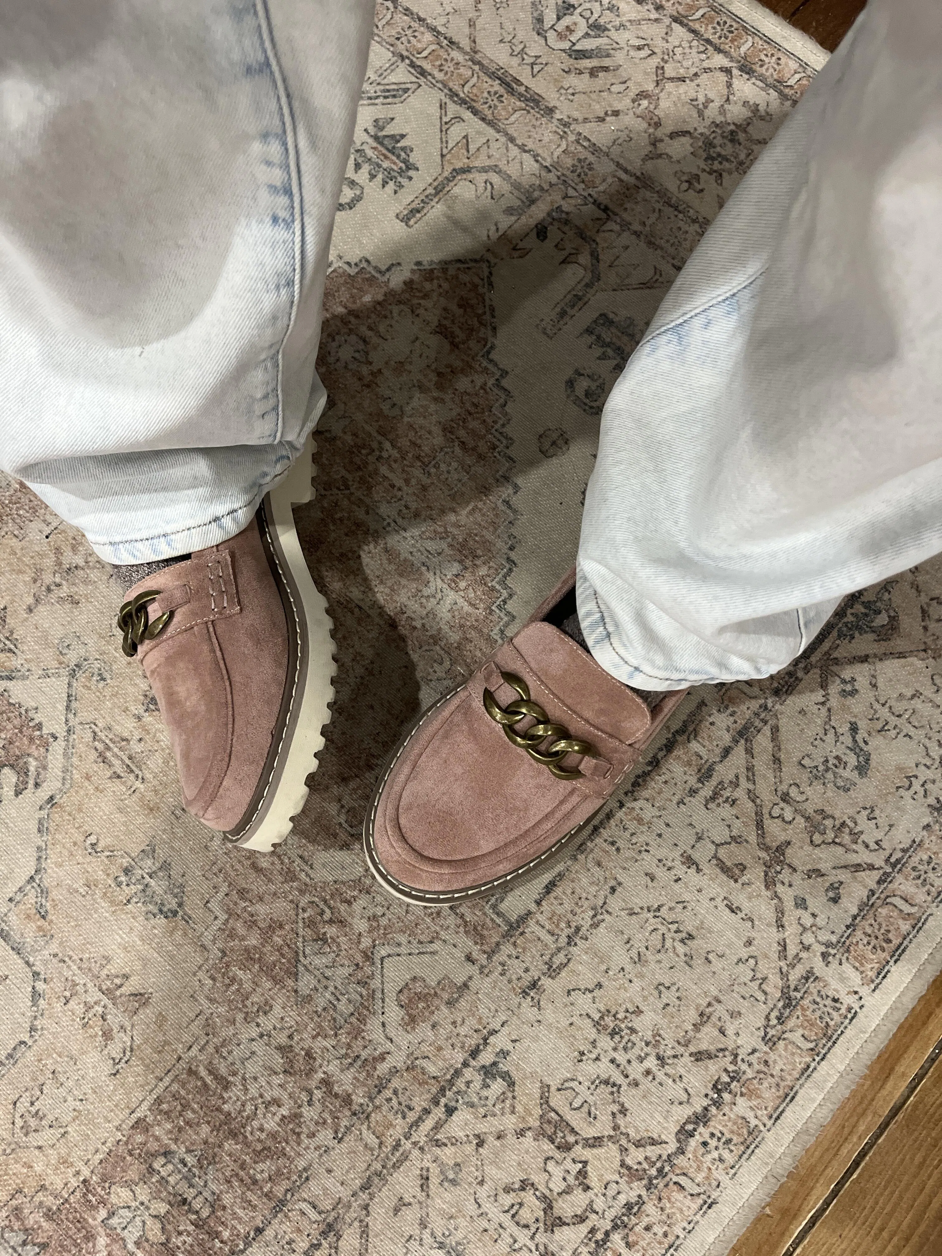 Take your shoe game to the next level with our Literally Faux Suede Loafers! These stylish loafers feature a gold chain detail and a slight heel for added elegance. With a unique old money, Mary Jane feel, you'll be the talk of the town. Step out in style today!